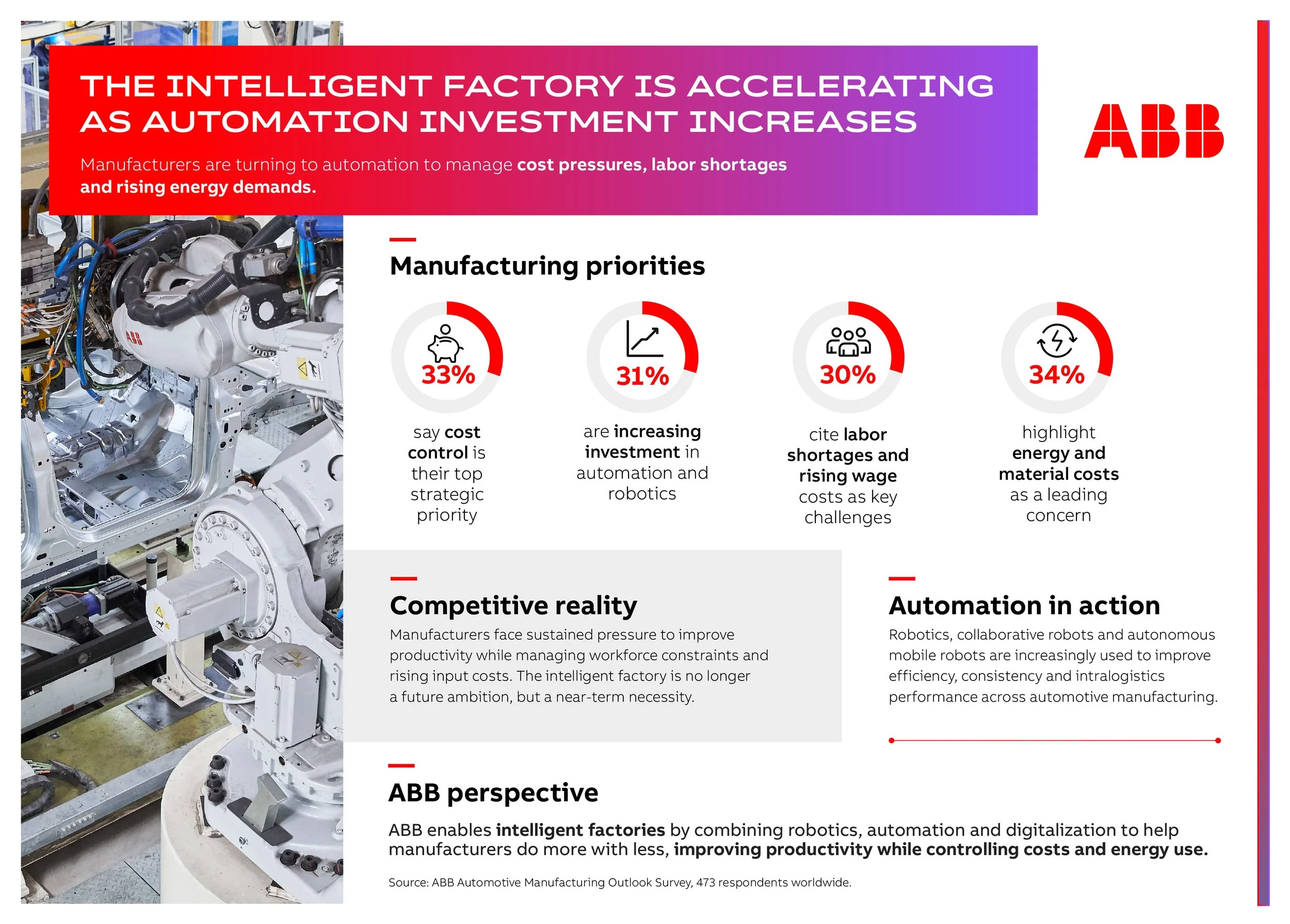 This year’s survey gathered insights from 473 automotive industry decision-makers from vehicle manufacturers and suppliers across the global value chain. Readers can find the full results at www.abb.com/global/en/areas/robotics/industries/automotive/manufacturing-outlook-survey