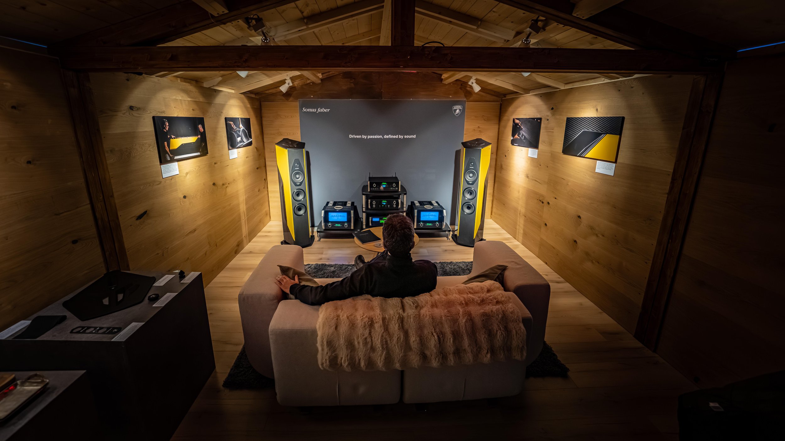 Sonus faber built a dedicated chalet for the brand, where guests enjoyed listening sessions with the exclusive Il Cremonese Ex3me-Automobili Lamborghini Edition speaker and explored Sonus faber craftsmanship. The brand worked alongside the Lamborghini team and ran hot laps set to a curated playlist, supporting every manoeuvre for a deeply immersive feel. Sonus faber also brought sound to hospitality areas, equipping every area and the lounge with the Omnia system and delivering in-car demos during dinner.